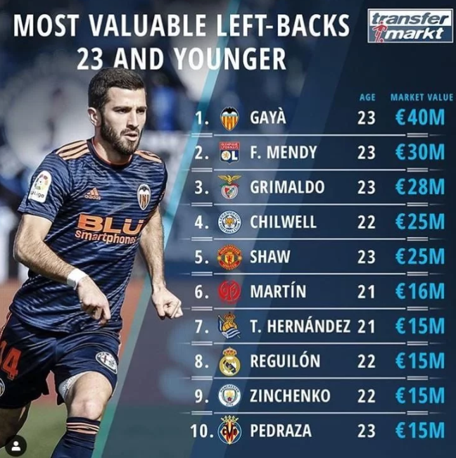 Возглавил рейтинг игрок Валенсии Хосе Гайя, которого оценили в 40 миллионов евро.