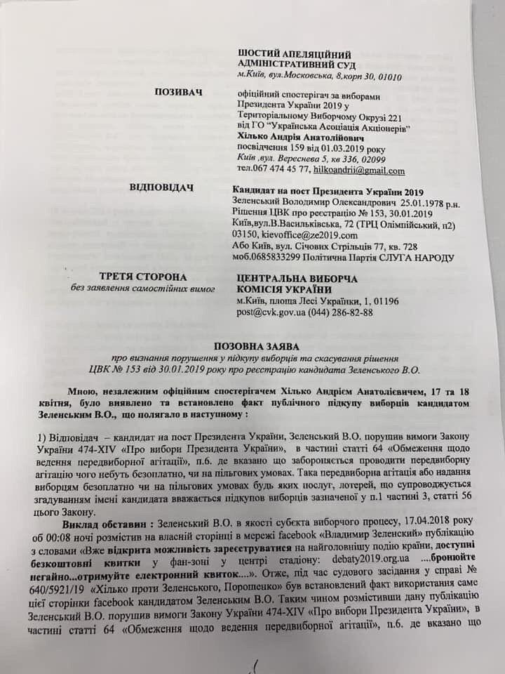 В субботу, 20 апреля Шестой апелляционный суд Киева должен быть начать в 21.00 рассмотрение дела о возможном аннулировании регистрации Владимира Зеленского кандидатом в президенты по иску адвоката Андрея Хилько.
