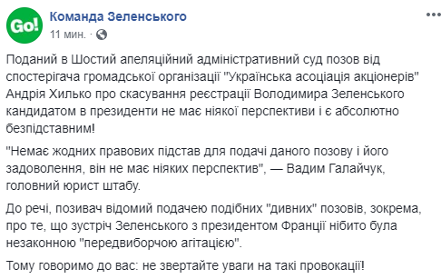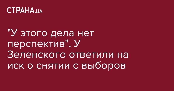 Поданный в суд иск об отмене регистрации Владимира Зеленского кандидатом в президенты не имеет никакой перспективы и является абсолютно безосновательным. Об этом в Facebook сообщает "Команда Зеленского".