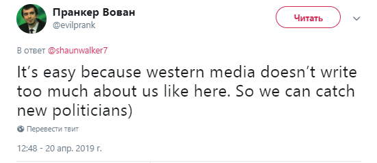 "Это легко, потому что западные СМИ не слишком много пишут о нас, как здесь. Таким образом, мы можем подлавливать новых политиков", - отметил пранкер.