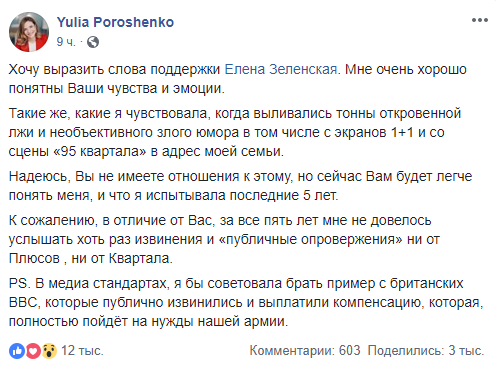 "Хочу выразить слова поддержки Елене Зеленской. Мне очень хорошо понятны Ваши чувства и эмоции. Такие же, какие я чувствовала, когда выливались тонны откровенной лжи и необъективного злого юмора в том числе с экранов 1+1 и со сцены "95 квартала" в адрес моей семьи. Надеюсь, Вы не имеете отношения к этому, но сейчас Вам будет легче понять меня, и что я испытывала последние 5 лет", - написала она в сети.