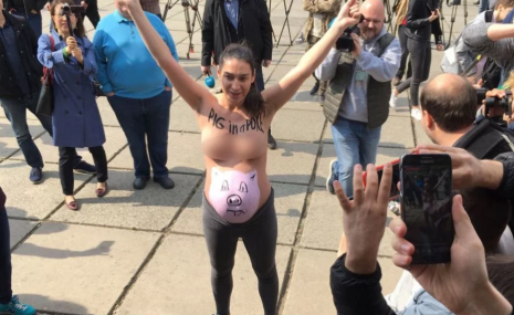 На животе у нее была нарисована морда кота, что означает: "Зеленский - кот в мешке". Активистка отметила, что выступает против обоих кандидатов в президенты Украины. По предварительным данным, полиция не задержала представительницу Femen.