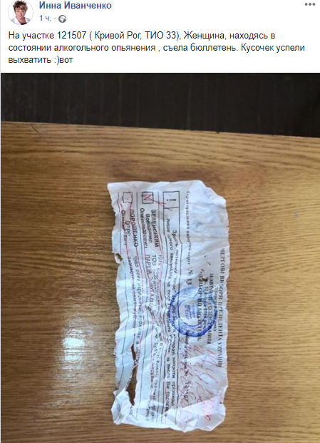 "Женщина, находясь в состоянии алкогольного опьянения, съела бюллетень. Кусочек успели выхватить", - написала Иванченко.