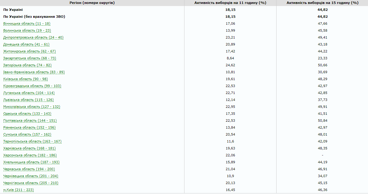 Активнее всего голосуют в Полтавской области (50,84%) Запороржской (50,66%), Николаевской (49,91%), Днепрпопетровской (49,41).