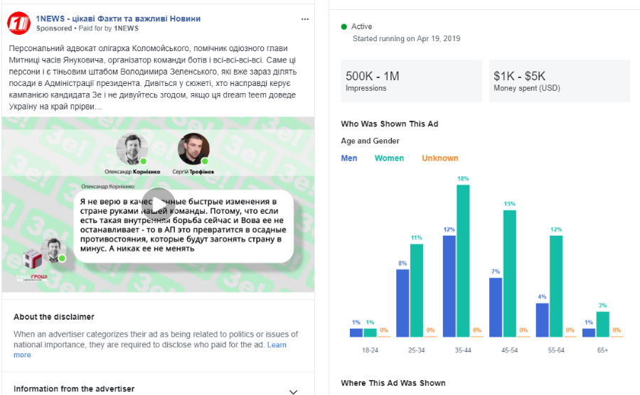 Также, в "Чесно" зафиксировали размещение рекламы против Зеленского. Еще в день тишины ее разместило новостное издание "1NEWS" с фрагментом расследования программы "Наши деньги с Денисом БИГУСОМ" относительно сфер влияния в избирательном штабе Зеленского.