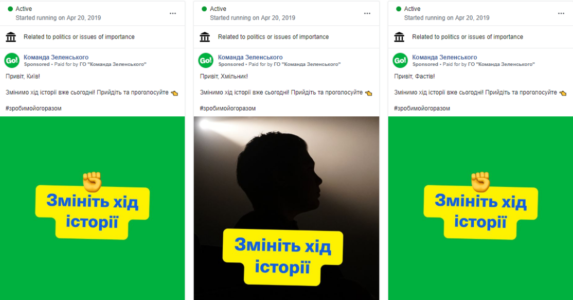 Гражданское движение "Чесно" сообщает, что в день выборов зафиксировал в Фейсбуке рекламу в пользу и против команды Зеленского. В частности, активно 430 рекламных постов, призывающих жителей Украины прийти и проголосовать. Об этом сообщает пресс-служба "Чесно".