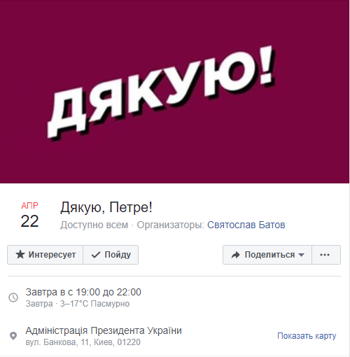 Встречу "Дякую, Петре!" в группах соцсети Facebook назначают на 19:00. Приглашение оформлено с целью выразить благодарность Петру Порошенко за все, что сделано за последние 5 лет. "Давайте придем и поблагодарим Петра Порошенко за все, что сделано за эти 5 лет, за ассоциации, безвиз, армию, децентрализацию и все остальное", - говорится в анонсе встречи.
