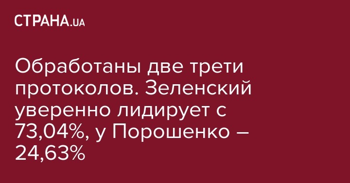 Более 73,04% избирателей отдали свои голоса за кандидата в президенты Владимира Зеленского. Действующий президент Украины Петр Порошенко получил 24,63% голосов. Об этом сообщает Центральная избирательна комиссия по итогам обработки 66,74% электронных протоколов.