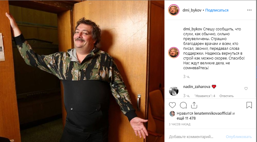 Писатель Дмитрий Быков впервые после госпитализации и искусственной комы обратился к своим друзьям, коллегам и поклонникам на своей странице в Instagram.