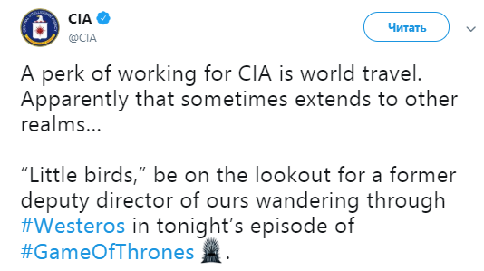 "Ищите нашего бывшего заместителя директора, который бродит по Вестеросу, в сегодняшнем эпизоде "Игры престолов", - говорилось в сообщении.