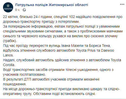 Около полуночи 22 апреля в Житомире произошло ДТП с участием автомобиля полиции. Об этом сообщает пресс-служба Патрульной полиции Житомирской области на странице в Facebook.
