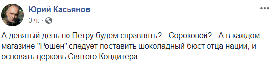 "А девятый день по Петру будем справлять?.. Сороковой?.. А в каждом магазине "Рошен" следует поставить шоколадный бюст отца нации, и основать церковь Святого Кондитера", - советует волонтер Юрий Касьянов.