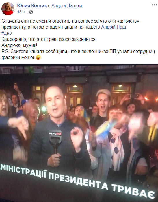 "Хватали за руки, толкали в спину, проклятиями сыпали, трогали камеру и активно препятствовали работе оператора. Так для меня прошло включения из-под Администрации Президента, где собрались люди поблагодарить Петра Порошенко за 5 лет замечательной работы!", - пишет Лащ в Facebook.