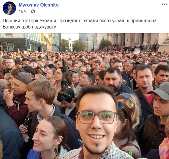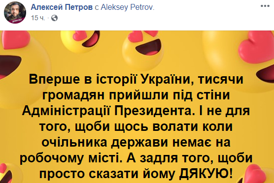 "Впервые в истории Украины, тысячи граждан пришли под стены Администрации Президента. И не для того, чтобы что-то кричать, когда главы государства нет на рабочем месте. А для того, чтобы просто сказать ему спасибо!", - пишет блогер Алексей Петров.
