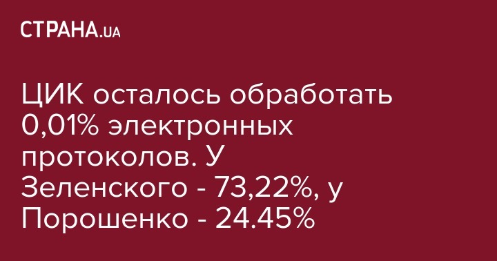 ЦИК осталось обработать 0,01% электронных протоколов. У Зеленского - 73,22%, у Порошенко - 24.45%