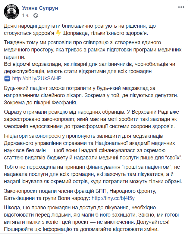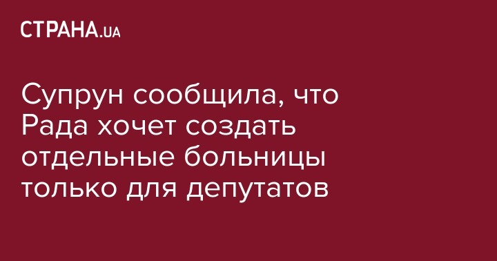 "Инициаторы законопроекта предлагают оставить для медучреждений Государственного управления делами и Национальной академии медицинских наук все без изменений - чтобы они и в дальнейшем финансировалась по отдельной статье расходов бюджета и оказывали медицинские услуги только для "своих", - возмущается Супрун.