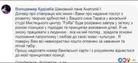 "Договор о сотрудничестве между мной и Вами о предоставлении услуг по развитию творческих способностей у Вашего сына Тараса в вокальной студии Художественного центра "FoRa" будет расторгнут завтра в связи с разной позицией в подходах и принципах воспитания детей. Я не смогу работать с человеком, который на мой взгляд, изменил основным положениям патриотизма и любви к своему языку и культуре", – написал Владимир Кудовба, который поддерживает Петра Порошенко.