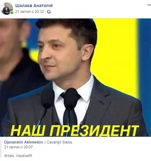 Примерно в 20:30 телеведущий канала "ПравдаТУТ" и депутат Новороздольского горсовета Анатолий Шалаев распространил на своей странице фотографию Владимира Зеленского с надписью "Наш президент". Некоторые пользователи соцсети начали возмущаться и писать комментарии вроде "Он мне не президент".
