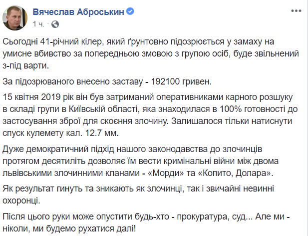 "Очень демократичный подход нашего законодательства к преступникам в течение десятилетий позволяет им вести криминальные войны между двумя львовскими преступными кланами - "Морды" и "Копыто, Доллара". В результате погибают и исчезают как преступники, так и обычные невинные охранники. После этого руки может опустить любой - прокуратура, суд ... Но мы - никогда, мы будем двигаться дальше!", - написал Вячеслав Аброськин.