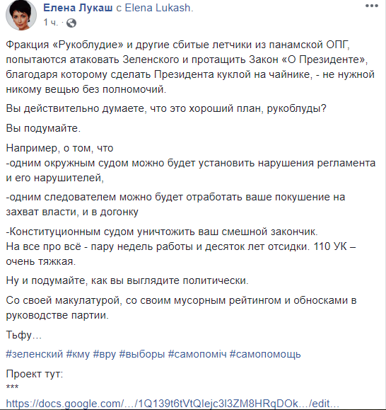 Вы подумайте. Например, о том, что одним окружным судом можно будет установить нарушения регламента и его нарушителей, одним следователем можно будет отработать ваше покушение на захват власти, и в догонку Конституционным судом уничтожить ваш смешной закончик. На все про всё - пару недель работы и десяток лет отсидки. 110 УК – очень тяжкая. Ну и подумайте, как вы выглядите политически. Со своей макулатурой, со своим мусорным рейтингом и обносками в руководстве партии. Тьфу…", - написала Елена Лукаш, опубликовав ссылку на текст проекта закона.