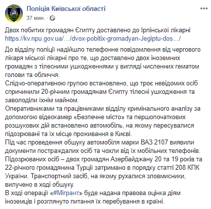 "В отдел полиции поступило телефонное сообщение от дежурного врача городской больницы (Ирпеня - прим. ред.) о том, что доставлены двое иностранных граждан с телесными повреждениями в виде многочисленных гематом головы и лица. Следственно-оперативной группой установлено, что трое неизвестных причинили 20-летним гражданам Египта телесные повреждения и завладели их имуществом", - говорится в сообщении.