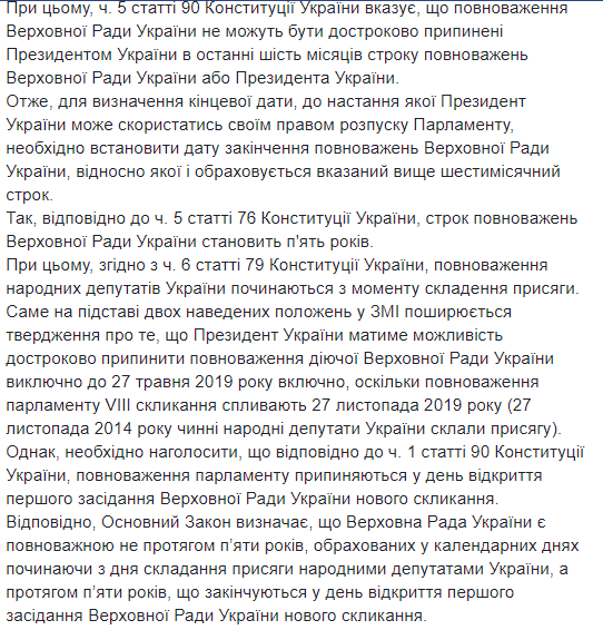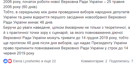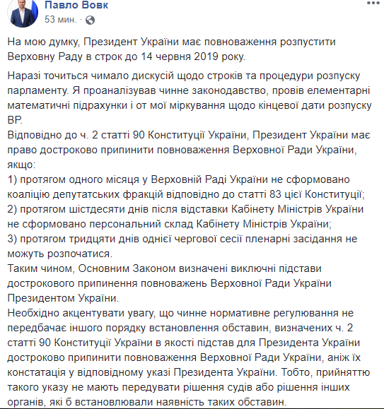 Таким образом, принимая во внимание назначение очередных выборов Верховной Рады на 27 октября 2019 года, полномочия действующей Верховной Рады Украины могут длиться и до 16 декабря 2019 года (27 октября 2019 + 20 дней на официальное обнародование результатов выборов +30 дней на открытие первой сессии новоизбранного Верховной Рады). Вовк уверен, что с теоретической и с практической точки зрения полномочия действующей Рады могут длиться до 14 декабря 2019 года, то есть еще в течение 48 дней после дня выборов, что предоставляет президенту право прекратить полномочия парламента в срок до 14 июня.