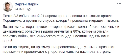 Нардеп Сергей Ларин: "Почти 2/3 избирателей 21 апреля проголосовали не столько против Порошенко, а против того курса, который проводила вчерашняя власть.