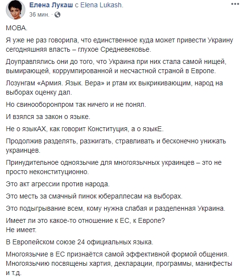 Но очень быстро принимают закон про Украинский язык. Который опять усилит раскол в обществе, которое и так , поделено на две части после выборов. Опять работать некогда, все в Фейсбуке, поливают друг друга помоями. Какая разница, на каком языке говорят люди, если они миллионами уезжают из страны???