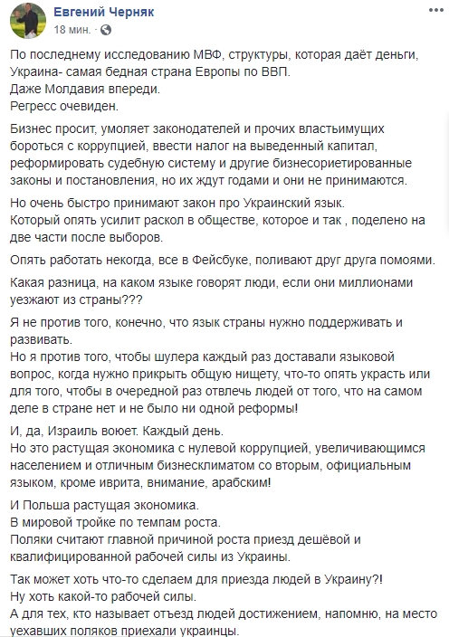 Если разочаровал кого-то извините, понимаю ваше желание верить в лучшее или жить в иллюзиях, но иллюзии плохая штука. Находясь в иллюзиях, ты все время идёшь не туда! Давайте уже займёмся экономикой. Это точно всех объединит. Средней зарплатой, например, в 1 тысячу Евро. Вот отличная задача на ближайшие пять лет. И возврат убежавших от таких законов Граждан Украины, которые прямо сейчас делают другие страны сильнее. Другие страны. Но не Украину".