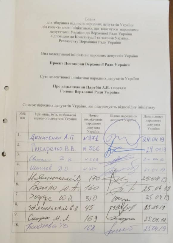 Ранее сообщалось, что нардеп Писаренко получил подписные листы для сбора подписей за отставку спикера Парубия.