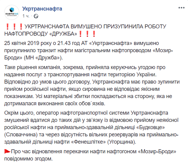 25 апреля 2019 в 21.43 АО "Укртранснафта" вынужденно приостановила транзит нефти по магистральному нефтепроводу "Мозырь-Броды" (МН "Дружба"), сообщает пресс-служба компании.