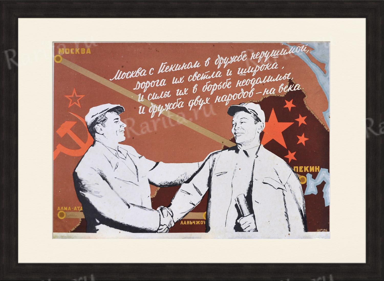 На плакате изображены рабочие двух стран, приветствующие друг друга. Они стоят на фоне карты СССР и Китая, на которой обозначены и соединены линией железной дороги города Москва, Пекин, Алма-Ата и Ланьчжоу. Плакат приурочен к открытию участка Транссиба: Москва - Улан-Батор - Пекин (1 января 1956 года) и сдаче в эксплуатацию гостиницы "Пекин" в Москве.