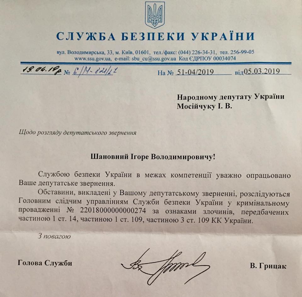 Он приложил к посту ответ СБУ на его депутатское обращение. В документе речь идет о том, что обстоятельства, изложенные Мосийчуком, "расследуются Главным следственным управлением СБУ в уголовном производстве №22018000000000274". Однако номер ЕРДР соответствует 2018 году. Пост Муджабаева появился только в 2019 году (сразу после первого тура). Соответственно, либо в СБУ ошиблись, либо нардеп неправильно интерпретировал ответ правоохранителей, либо же заявление Мосийчука отнесли к какому-то старому уголовному делу.