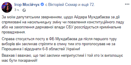 "По моему депутатскому обращению относительно Айдер Муждабаев за действия направленные на насильственное изменение или свержение конституционного строя или на захват государственной власти СБУ расследует уголовное производство. Дело касается поста в ФБ Муждабаева, где после первого тура выборов он призвал стрелять в спину тем, кто проголосовал не за Порошенко, и отсоединить 6-8 областей Украины", - написал Мосийчук.