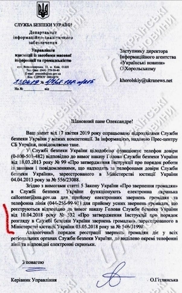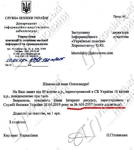 При этом, на запрос "Украинских новостей" в СБУ подтвердили, что само обращение "Миротворца" и было квалифицировано в спецслужбе как анонимка, о чем свидетельствует присвоенный обращению индекс "АН".