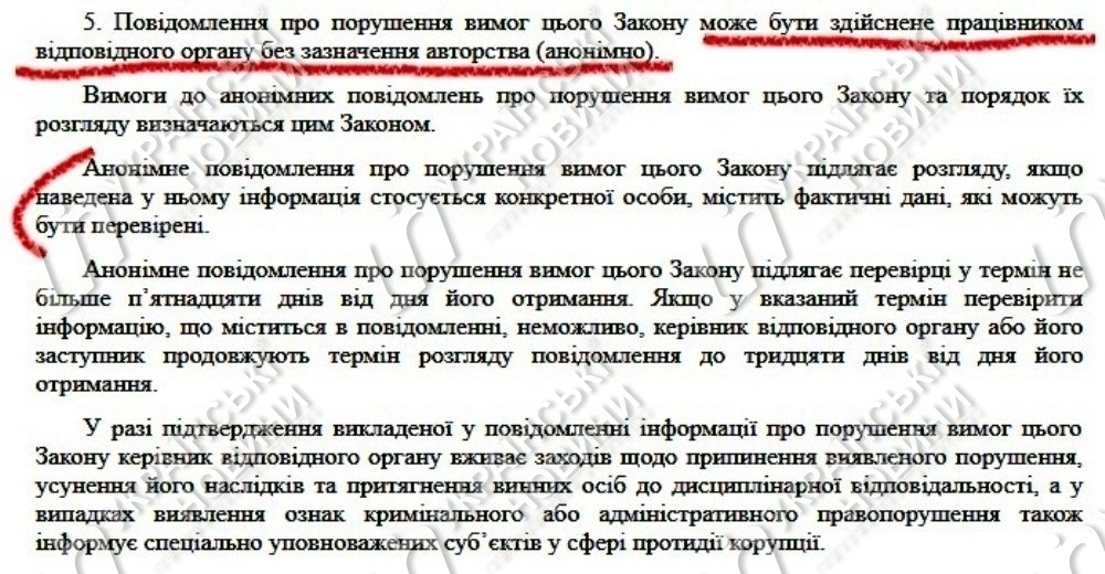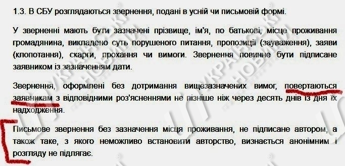 В Инструкцию СБУ были полностью скопированы два абзаца из Закона "О противодействии коррупции", а также добавлена дополнительная строчка: "сообщения граждан, которые содержат сведения, которые относятся к полномочиям СБУ". Фактически, эта строчка имеет широкое трактование и дает право СБУ брать в работу анонимные сообщения из любой сферы.