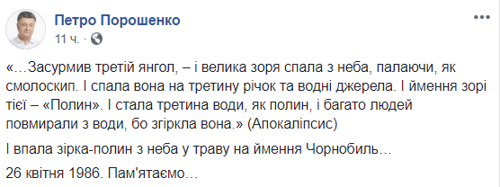 На этом фоне Петр Порошенко, который подписывал это драконовское сокращение, сегодня призвал помнить Чернобыль. И даже процитировал стих из Апокалипсиса Ионанна Богослова о "звезде полынь" - этот отрывок часто упоминают в контексте аварии на АЭС, потому что полынью в Украине зовется растение чернобыльник.