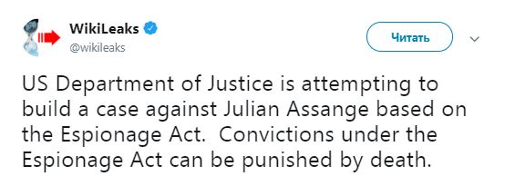 "Министерство юстиции США пытается завести дело в отношении Джулиана Ассанжа, основанное на законе о шпионаже. Обвинения по закону о шпионаже могут караться смертью", - говорится в сообщении.