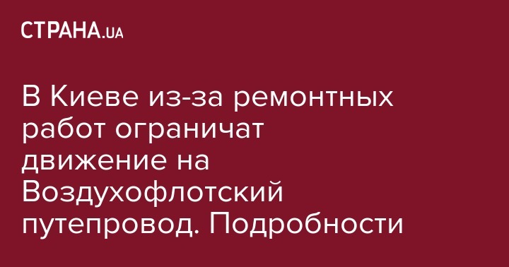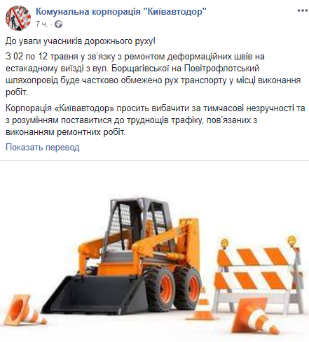 В Киеве с 2 по 12 мая ограничат движение транспорта на эстакадном выезде с ул. Боршаговской на Воздухофлотский путепровод. Об этом сообщилает  пресс-служба "Киевавтодора" на странице ведомства в Facebook.