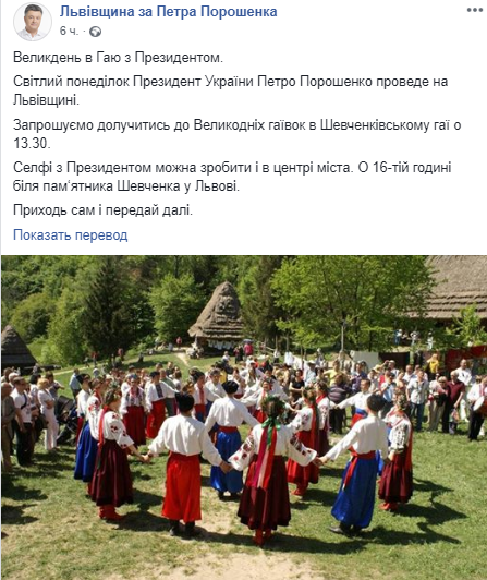Уточняется, что Петр Порошенко будет участвовать в мероприятиях, которые начнутся 29 апреля в 13:30 во Львове в Шевченковскою гаю. А в 16:00 в центре Львова, возле памятника Шевченко можно будет сделать селфи с действующим президентом.