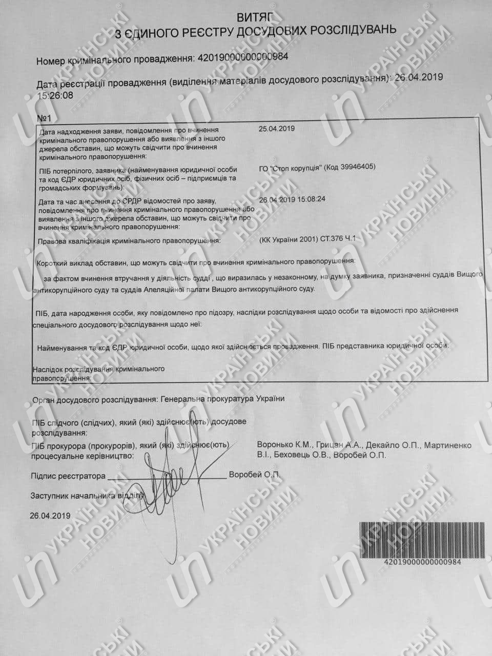Отмечается, что дело открыто по обращению общественной организации "Стоп коррупции". Уголовное производство было начато по части 1 статьи 376 (вмешательство в деятельность судебного органа) Уголовного кодекса.