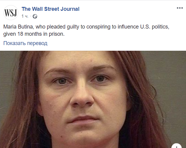 Суд в США вынес приговор россиянке Марии Бутиной, которая должна будет провести 18 месяцев в тюрьме за деятельность в интересах РФ в Америке. Об этом сообщает The Wall Street Journal в Facebook.