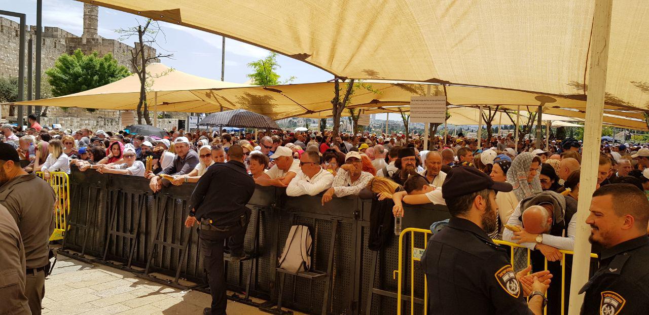 13:00 Перед Яффскими воротами собралось несколько тысяч верующих. Здесь центральный вход к Храму гроба Господня, но вход к нему полиция закрыла из-за огромного количества людей внутри храма и на близлежащей территории.