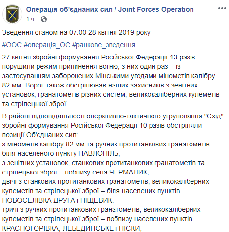 "27 апреля вооруженные формирования Российской Федерации 13 раз нарушили режим прекращения огня, из них один раз - с применением запрещенных Минскими соглашениями минометов калибра 82 мм. Вследствие обстрелов один военнослужащий Объединенных сил получил ранения", - сказано в сообщении.