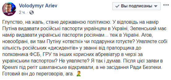 "Глупость, к сожалению, станет государственной политикой. В ответ на намерение Путина выдавать российские паспорта украинцам в Украине, Зеленский намерен выдавать украинские паспорта россиянам ... тоже в Украине. Эй, новоизбранные, вы там Путину "ответку" или подарки готовите? Представляете себе количество российских "диссидентов" в звании от прапорщика до полковника ФСБ, ГРУ и других полезных аббревиатур станут в очередь за украинским паспортом? Не представляете? Я так и думал. После этого заявления в Кремле под хохот шампанское открывали, а не заседание Совета Безопасности. Готов он к переговорам,