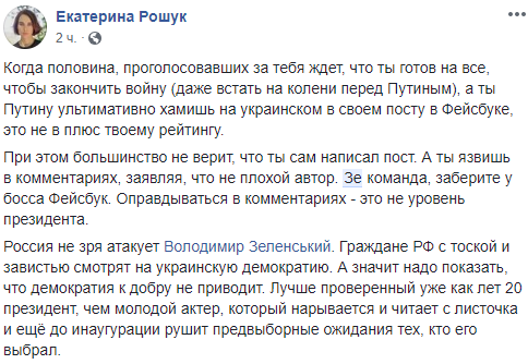 "Когда половина, проголосовавших за тебя ждет, что ты готов на все, чтобы закончить войну (даже встать на колени перед Путиным), а ты Путину ультимативно хамишь на украинском в своем посту в Фейсбуке, это не в плюс твоему рейтингу", - замечает журналистка Екатерина Рошук.
