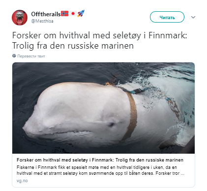"Мы знаем, что в России держат прирученных китов, и что некоторые из них сбегают и следуют за нашими лодками", - сказал профессор Университета Тромсе Ойдин Рикардсен. Он добавил, что разговаривал с несколькими российскими учеными, и они сказали, что белуха могла принадлежать военной базе в Мурманске.