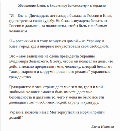 "Предложение президента Украины Владимира Зеленского о предоставлении россиянам украинского гражданства может оказаться для меня последней надеждой и возможностью найти страну, которая стала бы мне домом", - пишет Елена.