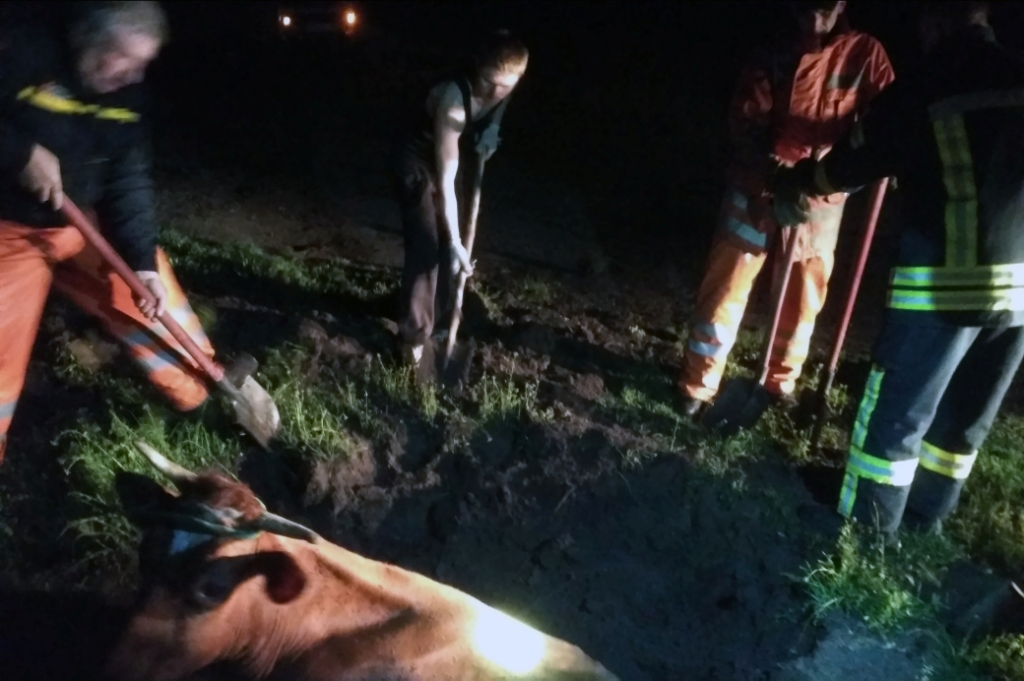 В селе Евдокиевка Днепропетровской области случилось необычное происшествие. Здесь корова по кличке Зорька упала в сливную яму и чтобы освободить животное из ловушки на место ЧП прибыло подразделение ГСЧС.
