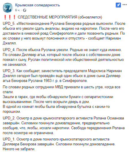Сообщается, что следственные мероприятия российские силовики провели в домах крымскотатарских активистов Ролана Османова и Дилявера Бекирова. Позже в Симферополе провели обыск и задержали сына Бекирова Руслана. После обыска его увезли сдать анализы, видимо, на наркотики. После чего его доставили в Киевский РОВД Симферополя и дали позвонить родным. Сообщается, что у него возьмут пояснения и отпустят.